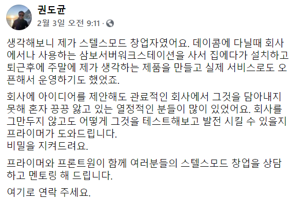 스텔스창업이란? Primer 권도균 대표님 글펌, 스텔스창업 단톡방 개설
